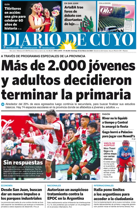 Diario de Cuyo | HOME | Edición impresa Tapa Edición 30 de Marzo de 2025 Por Redacción Diario de Cuyo 30/03/2025 · 4:00 Escuchar la noticia Escuchar la noticia Your browser doesn’t support HTML5 audio Ver los comentarios ›