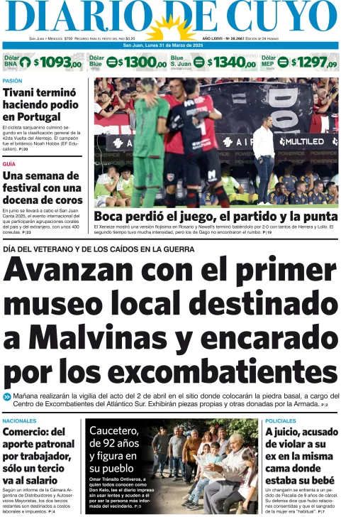 Diario de Cuyo | HOME | Edición impresa Tapa Edición 31 de Marzo del 2025 Por Redacción Diario de Cuyo 31/03/2025 · 4:00 Escuchar la noticia Escuchar la noticia Your browser doesn’t support HTML5 audio Ver los comentarios ›