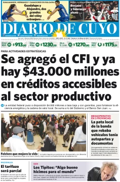 Diario de Cuyo | HOME | Edición impresa Tapa Edición 31 de Mayo del 2024 Por Redacción Diario de Cuyo 31/05/2024 · 4:00 Escuchar la noticia Escuchar la noticia Your browser doesn’t support HTML5 audio Ver los comentarios ›