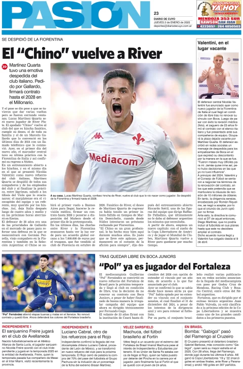 Diario de Cuyo | HOME | Edición impresa Tapa Pasión 02 de Enero de 2025 Por Redacción Diario de Cuyo 02/01/2025 · 4:00 Escuchar la noticia Escuchar la noticia Your browser doesn’t support HTML5 audio Ver los comentarios ›