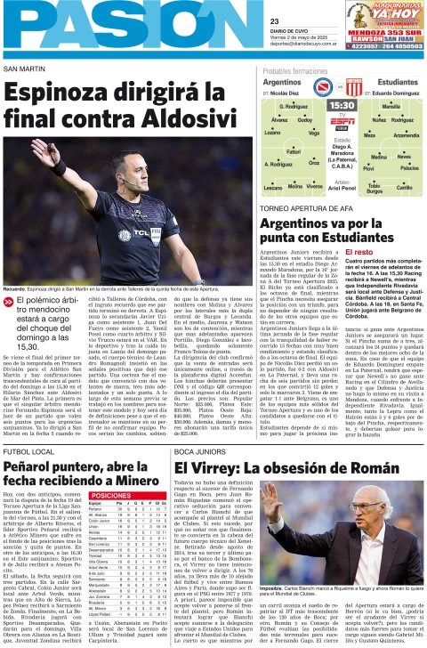 Diario de Cuyo | HOME | Edición impresa Tapa Pasión 02 de Mayo de 2025 Por Redacción Diario de Cuyo 02/05/2025 · 4:00 Escuchar la noticia Escuchar la noticia Your browser doesn’t support HTML5 audio Ver los comentarios ›