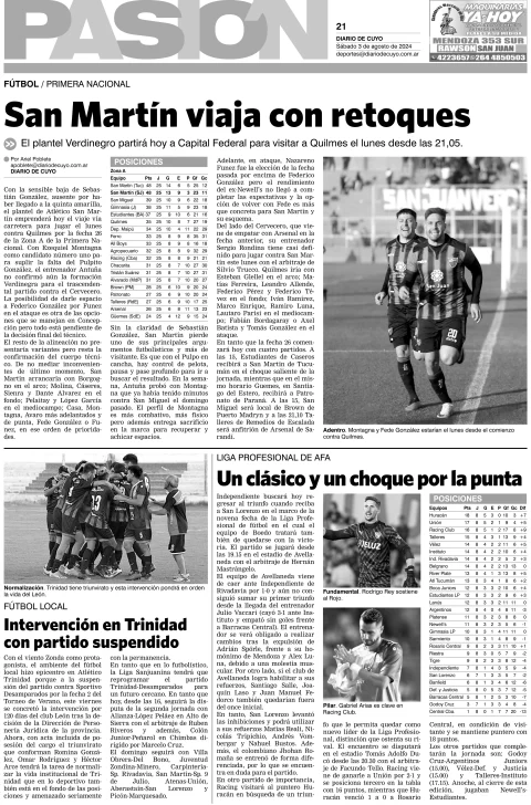 Diario de Cuyo | HOME | Edición impresa Tapa Pasión 03 de Agosto de 2024 Por Redacción Diario de Cuyo 03/08/2024 · 4:00 Escuchar la noticia Escuchar la noticia Your browser doesn’t support HTML5 audio Ver los comentarios ›