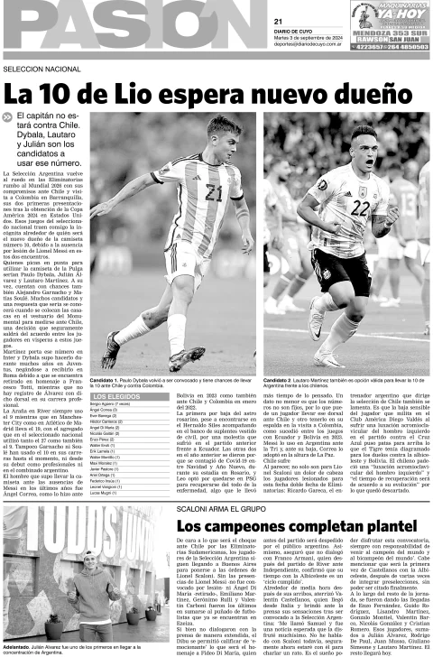 Diario de Cuyo | HOME | Edición impresa Tapa Pasión 03 de Septiembre del 2024 Por Redacción Diario de Cuyo 03/09/2024 · 4:00 Escuchar la noticia Escuchar la noticia Your browser doesn’t support HTML5 audio Ver los comentarios ›