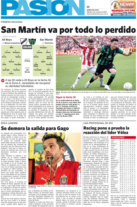 Diario de Cuyo | HOME | Edición impresa Tapa Pasión 05 de Octubre de 2024 Por Redacción Diario de Cuyo 05/10/2024 · 4:00 Escuchar la noticia Escuchar la noticia Your browser doesn’t support HTML5 audio Ver los comentarios ›