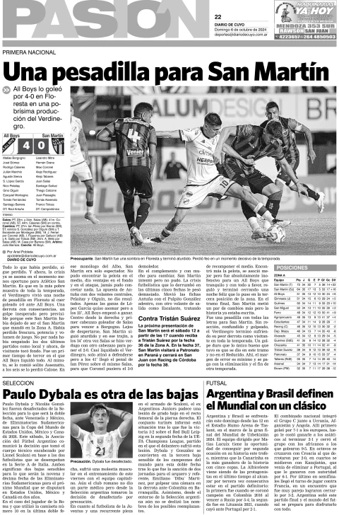 Diario de Cuyo | HOME | Edición impresa Tapa Pasión 06 de Octubre de 2024 Por Redacción Diario de Cuyo 06/10/2024 · 4:00 Escuchar la noticia Escuchar la noticia Your browser doesn’t support HTML5 audio Ver los comentarios ›