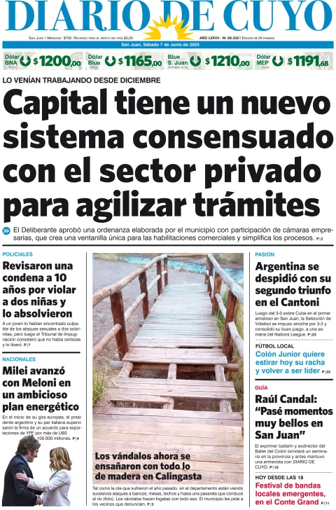 Diario de Cuyo | HOME | Edición impresa Tapa Edición impresa 07 de Junio del 2025 Por Redacción Diario de Cuyo 07/06/2025 · 4:00 Escuchar la noticia Escuchar la noticia Your browser doesn’t support HTML5 audio Ver los comentarios ›