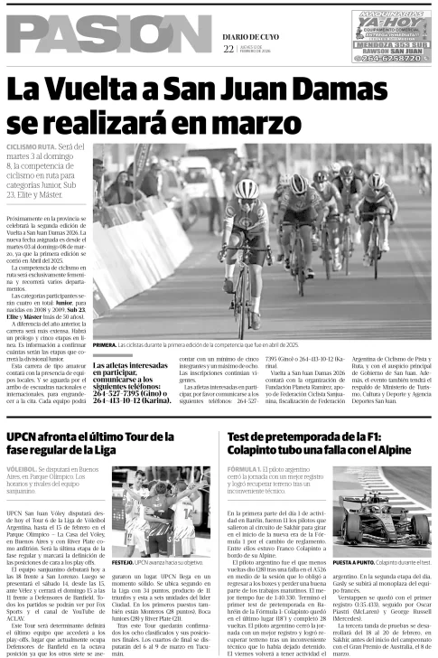Diario de Cuyo | HOME | Edición impresa Tapa Pasion 12 de Febrero 2026 Por Redacción Diario de Cuyo 12/02/2026 · 4:00 Escuchar la noticia Escuchar la noticia Your browser doesn’t support HTML5 audio Ver los comentarios ›