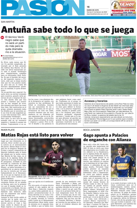 Diario de Cuyo | HOME | Edición impresa Tapa Pasión 21 de Febrero del 2025 Por Redacción Diario de Cuyo 21/02/2025 · 5:00 Escuchar la noticia Escuchar la noticia Your browser doesn’t support HTML5 audio Ver los comentarios ›