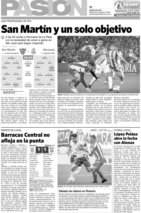 Diario de Cuyo | HOME | Edición impresa Tapa Pasión 23 de Agosto de 2025 Por Redacción Diario de Cuyo 23/08/2025 · 4:00 Escuchar la noticia Escuchar la noticia Your browser doesn’t support HTML5 audio Ver los comentarios ›