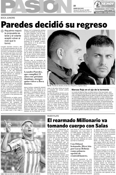 Diario de Cuyo | HOME | Edición impresa Tapa Pasión 27 de Junio de 2025 Por Redacción Diario de Cuyo 27/06/2025 · 4:00 Escuchar la noticia Escuchar la noticia Your browser doesn’t support HTML5 audio Ver los comentarios ›