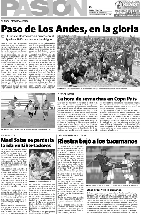 Diario de Cuyo | HOME | Edición impresa Tapa Pasión 29 de Julio de 2025 Por Redacción Diario de Cuyo 29/07/2025 · 4:00 Escuchar la noticia Escuchar la noticia Your browser doesn’t support HTML5 audio Ver los comentarios ›