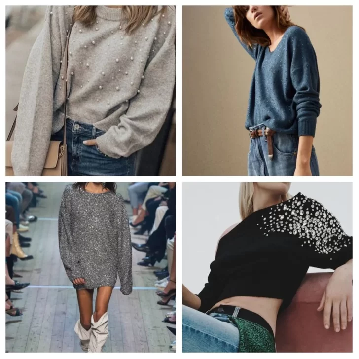 > Sweaters con brillos . Los adornos, el alto brillo y el destello fueron omnipresentes en las pasarelas del Otoño/Invierno. Las prendas de punto son una pieza de vestuario inesperada que ofrece una forma divertida de jugar con la tendencia del brillo opulento con mayor versatilidad y menor compromiso que ropa de noche más tradicional. Desde prendas de punto adornadas con lentejuelas líquidas por toda la superficie, ganchillo reluciente y suéteres adornados con cristales , hay muchas opciones para capturar la cantidad justa de brillo.