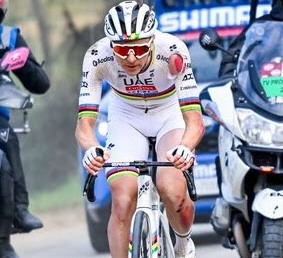 Cruzó la línea de meta en soledad, aferrado al manillar de su bicicleta con determinación y autoridad. Con su hombro y codo del brazo derecho lastimados por una caída sufrida cuando faltaban 45 kilómetros. El británico Tom Pidcock, lo esperó y juntos siguieron abriendo el camino, hasta que faltando 18.5 kilómetros