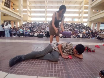 Con los acordes de Balada para un loco empezó la fiesta. El tema de Ferrer-Piazzolla plasmó el espíritu de la apuesta e hilvanó las canciones que desgranaron los chicos. Arrancaron tímidamente con 11 y 6, se entonaron con Capullito de Alelí y explotaron con Pa’ Bailar y Mala letra. De a momentos por sectores, en otros todos juntos, con pequeñas coreos en el lugar, desde los chiquitos de jardín hasta los de secundaria compartieron y brindaron su arte en un clima de alegría, que también tuvo momentos de profunda concentración para seguir lo que indicaban las profes. A propósito, capítulo aparte merecen las docentes de música que, entregadísimas, dirigían cada grupo bajo la batuta general de Quiroga. Entre ellas, Barbero, una verdadera mujer orquesta: co-dirigía a los niños, daba entrada a la banda, supervisaba el sonido, subía gradas como gato para guiar al grupo de percusión, marcaba el ritmo con un silbato, cantaba, bailaba y hasta mostraba sus dotes de actriz al micrófono.