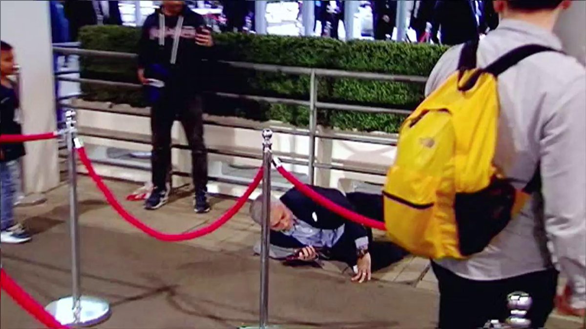 Mourinho llegó apurado y quiso pasar cuerda de seguridad por encima, con tanta mala fortuna, que su pie quedó enganchado a la cuerda y le provocó una aparatosa caída. Lo increíble fue que no atinó a poner los brazos y eso hizo aún más terrible su blooper.