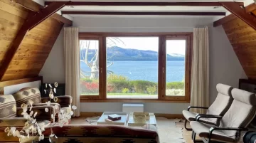 “Parque con césped, frutales y árboles autóctonos, con vista directa al lago Nahuel Huapi y a la Isla Victoria. La propiedad cuenta con un acceso peatonal a un deck sobre el lago, por un hermoso sendero en el bosque. Todo lo necesario para disfrutar días de tranquilidad en la naturaleza”, indican los dueños del lugar.
