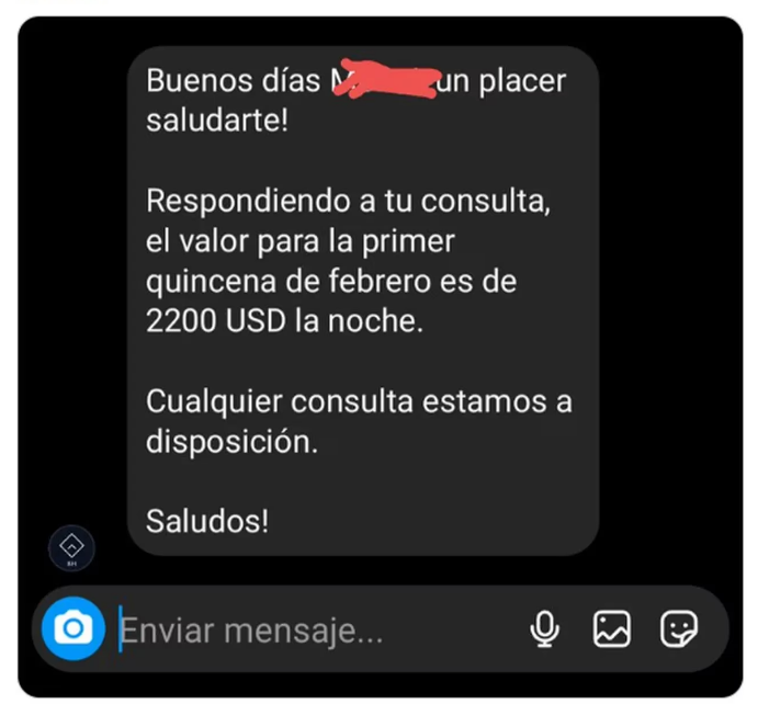 “Buenos días, M. Un placer saludarte”, fue el comienzo de la respuesta que recibió un usuario de Twitter luego de consultar por el alquiler de una casa en Bariloche para la primera quincena de febrero de 2024.
