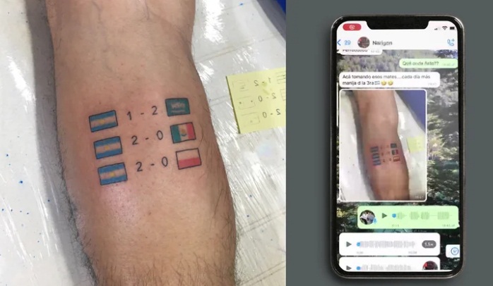 “No amigo, que mate. ¿Estás drogado vos, papá? ¡¿Qué te hiciste, boludo?! Flasheaste. ¡Hay que esperar un poco!”, le dice Leandro Cordasco a su amigo de toda la vida, Gonzalo De Santis por WhatsApp cuando le escribe que está tomando mate y le envía la foto recién tatuado con los resultados de la primera ronda del Mundial Qatar 2022.