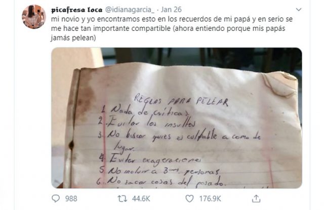 Se trata de una publicación viral de una joven usuaria de Twitter llamada Idina García. La chica, encontró entre las pertenencias de su padre, las “11 reglas que tenia para pelear” con su madre. Lo curioso es que, según cuenta la chica, ellos nunca se peleaban.