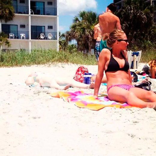 Se trata de la otra mujer que está recostada sobre la arena, pero cuya pálida piel casi no hace contraste con el medio que la rodea. Por eso, algunos usuarios -al menos en un primer momento- no se percataron de su presencia.