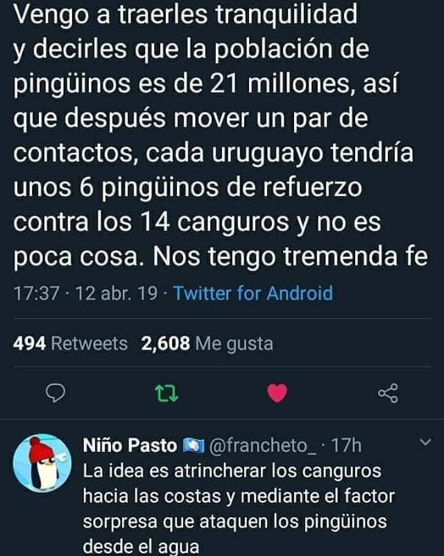 Todo comenzó con una publicación en Twitter, en la que un usuario compartió el dato, pero desde hace algunos días se está viralizando en redes sociales: en Australia hay 47 millones de canguros y en Uruguay hay 3.457.000 habitantes. La deducción que hacen es que "si los canguros deciden invadir Uruguay, a cada uruguayo le toca pelear con 14 canguros".
