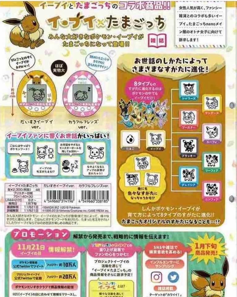De acuerdo al panfleto virtual, esta nueva generación de Tamagotchis llegaría bajo el nombre de Tamagotchi Nano y tendría una presentación marrón y otra rosa, de colección, titulada "Eeve and Colorful Friends".