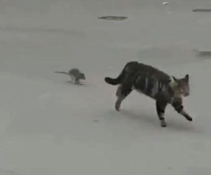 En la filmación, se observa a un gato que va en busca de un ratón que estaba cruzando la calle. El roedor, lejos de asustarse, intimida al gato y comienza a correrlo durante varios metros.