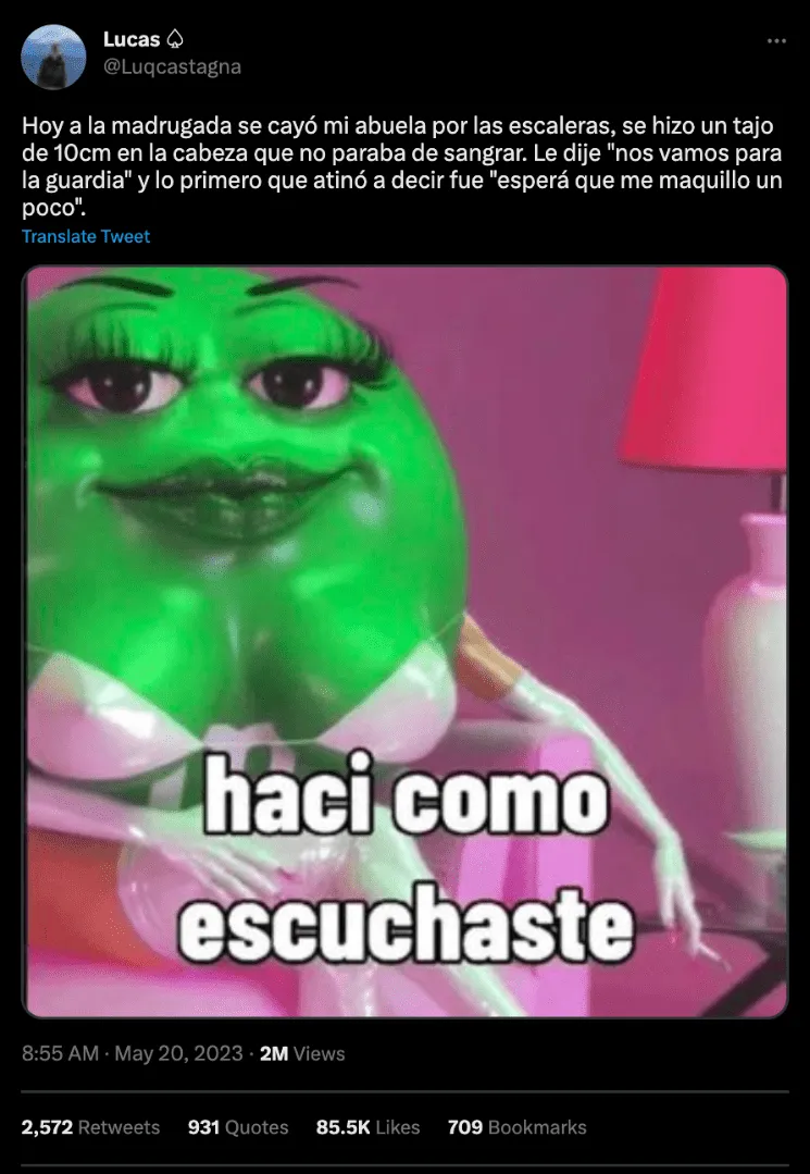 Como era de esperarse, en la red social del pajarito todos "amaron" a la abuela de Lucas. "No puede ser. La amo", escribió un internauta, mientras que otro comentó: "Literal dijo "muerta antes que sencilla"". "Jaja literal. Rodó fácil 20 escalones. La sacó barata por suerte", remarcó el nieto.