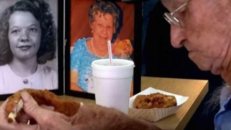 En un lugar de comida rápida, un hombre mayor de edad decidió sentarse a comer acompañado por la fotografía de su esposa fallecida.Testigos del emotivo hecho tomaron fotos al anciano que no podía parar de observar, con infinita tristeza, a su ex mujer mientras intentaba saborear su comida.