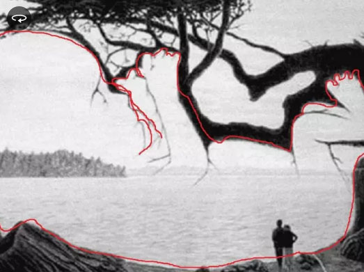 En la imagen se observa el paisaje en blanco y negro donde hay una pareja de enamorados mirando un lago, pero en realidad esconde a un bebé. ¿Lográs encontrarlo?