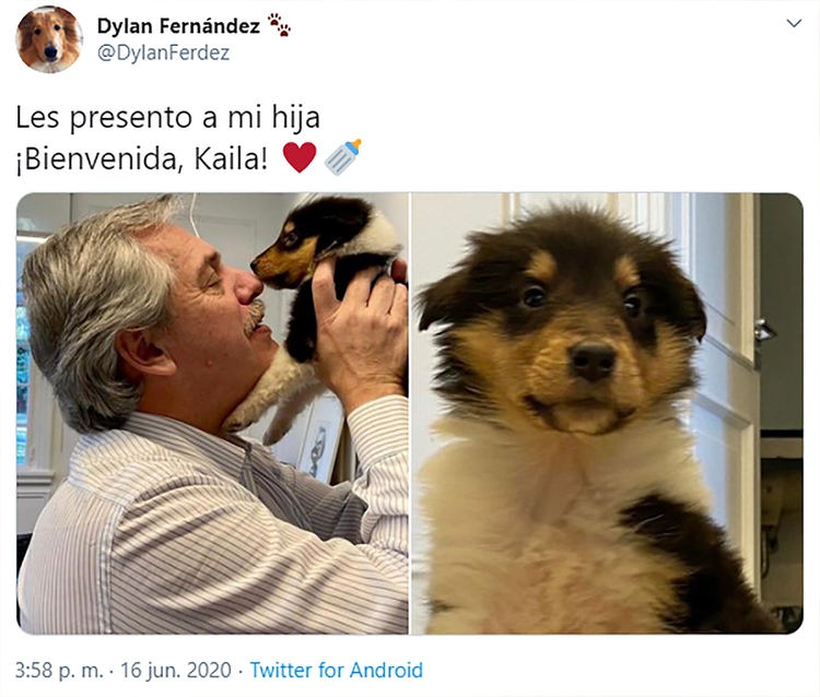 Dylan, el perro del presidente Alberto Fernández, fue padre nuevamente. El personal de comunicación que rodea al jefe de Estado dio a conocer la noticia a través de las redes sociales que le armaron a la mascota. La nueva hija se llama Kaila.