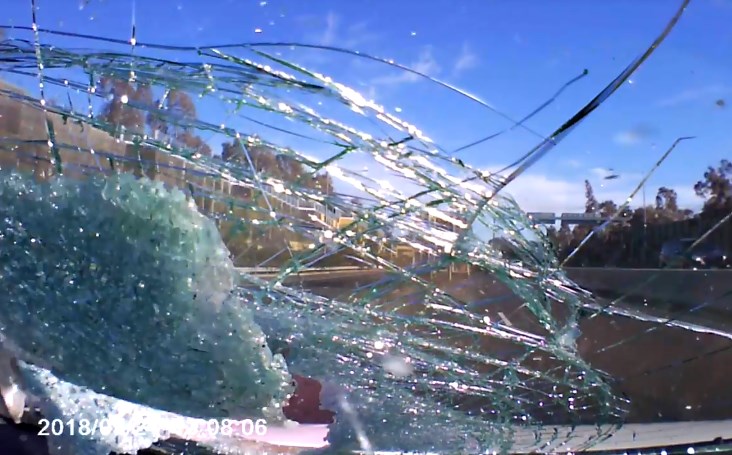 Una mujer australiana ha difundido a través de Facebook aterradoras imágenes registradas por la cámara de su coche, que muestran el momento en que un objeto metálico sale despedido de un camión e impacta contra el parabrisas de su automóvil.