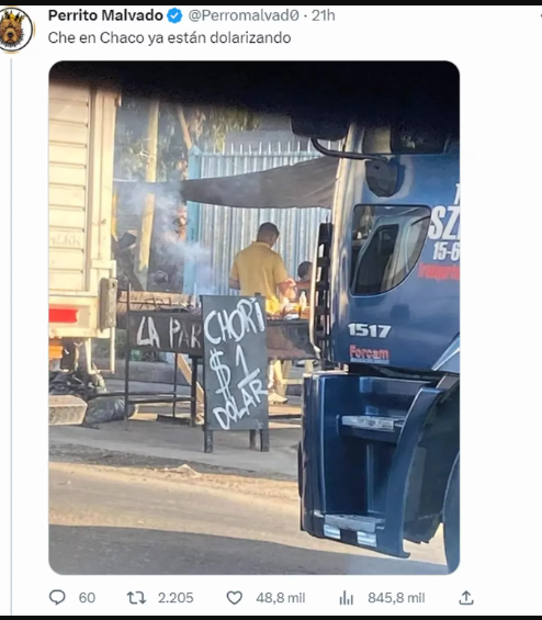 “Chori, 1 dólar”, decía el cartel del parrillero que ofrecía sus productos en la vía pública. El usuario de Twitter, bajo el nombre @Perromalvad0, se encarga de subir todo tipo de memes y situaciones extrañas que ocurran en el día a día, pero esta en particular se volvió viral de inmediato, alcanzando casi 1 millón de visualizaciones y más de 48.000 “likes”.