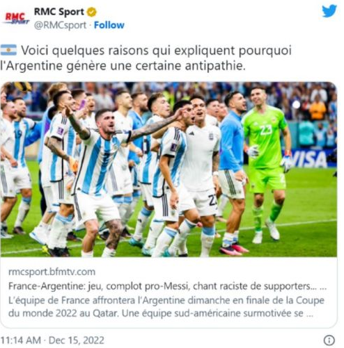 Aunque una gran parte de los futboleros alrededor del mundo quieren ver a Lionel Messi levantando el trofeo más precioso al terminar el partido de la final del Mundial Qatar 2022, hay un sector que no tiene a la Selección Argentina como la preferida, y así lo demostró RMC Sport, importante diario francés, publicó una nota dando motivos por los cuales el combinado albiceleste genera "antipatía".