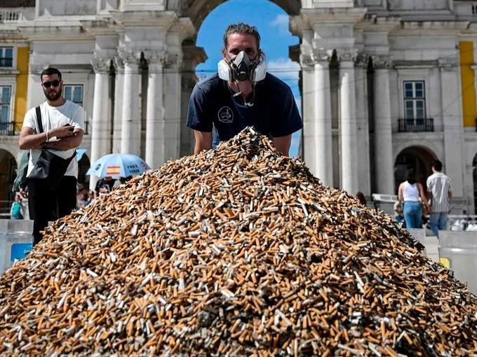 Por qué activistas hicieron una montaña de colillas en una plaza de Lisboa