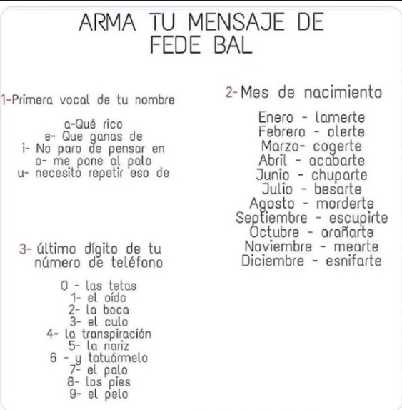 La imagen que se comenzó a difundir entre los usuarios propone que cada persona pueda armar su propia oración de alto voltaje dependiendo de algunas cuestiones personales. El resultado final del juego dependerá de: la primera vocal del nombre, el mes de nacimiento y el último dígito del número de celular.