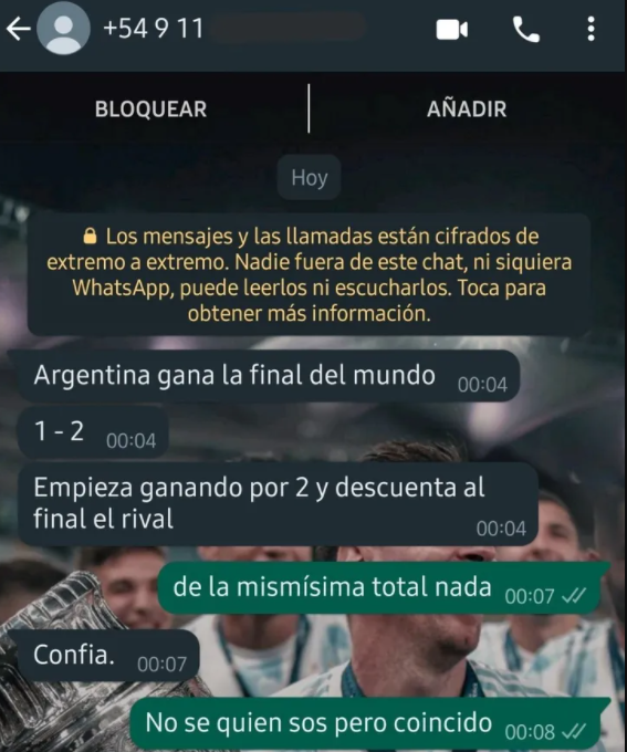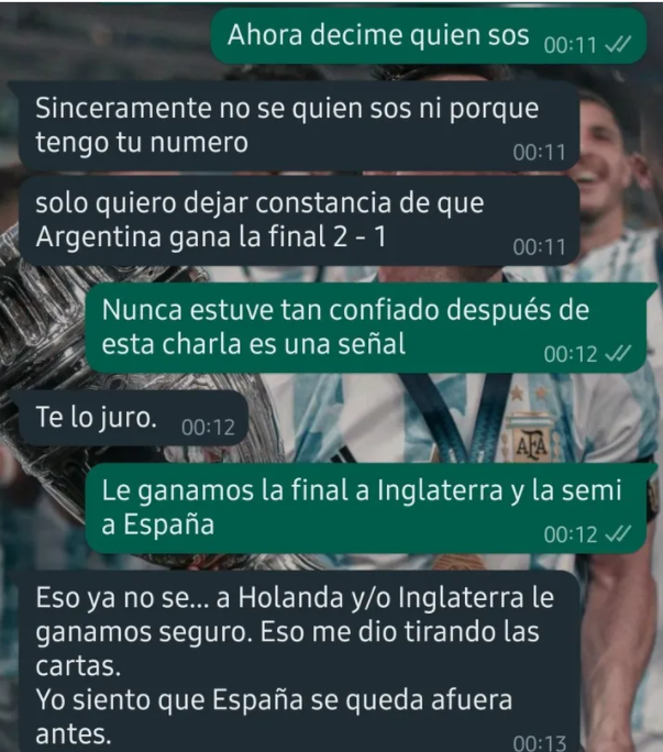 La charla siguió, y el supuesto visionario, le aclaró: "Sinceramente no se quién sos ni por qué tengo tu número. Solo quiero dejar constancia de que Argentina gana la final 2-1".