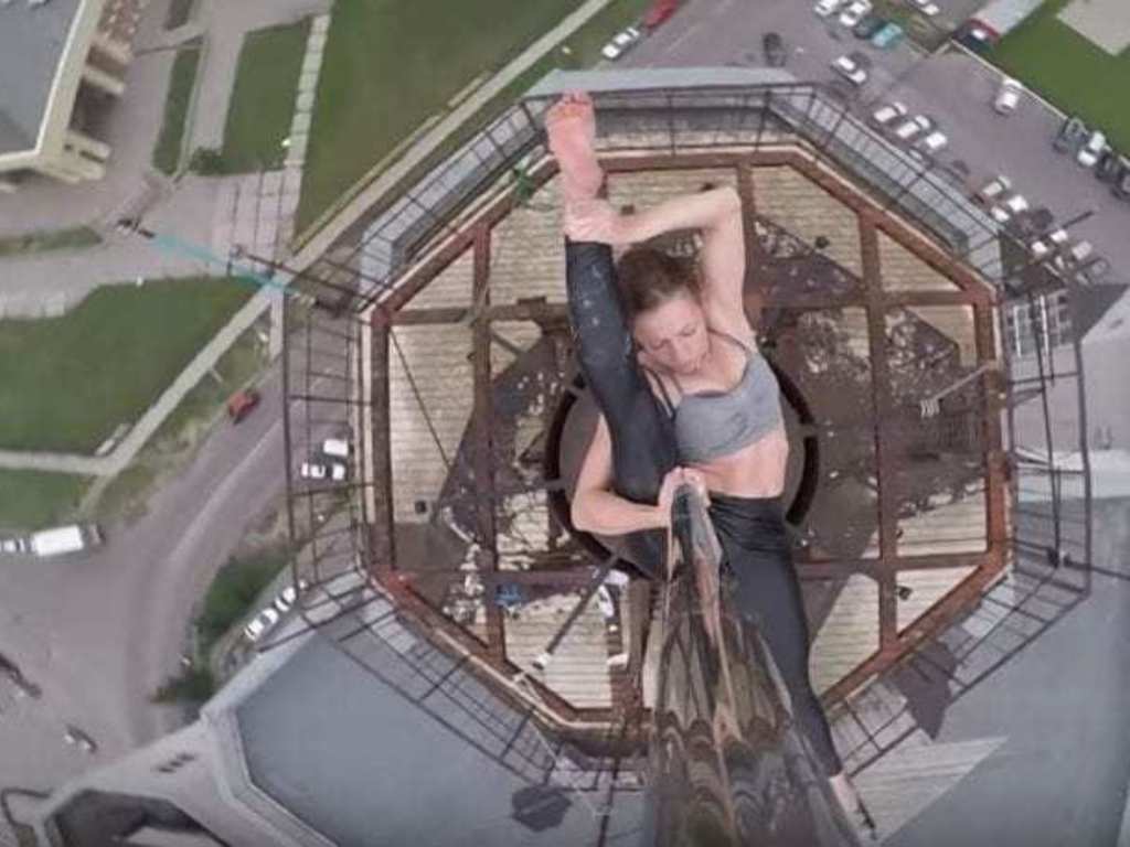 La bailarina rusa Marina Korzhenevskaya, de 27 años, realizó el desafío en un edificio de 16 pisos (más de 80 metros) ubicado en la ciudad de Voronezh, en Rusia.