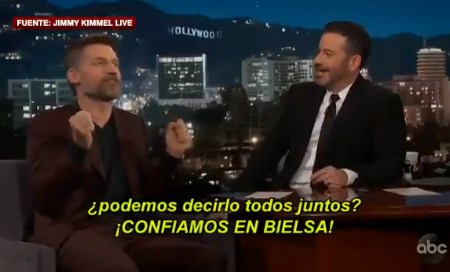 "Hay una teoría. Todos creen que un elegido vendrá y salvará el día. ¡El elegido! Y creo que todos piensan que es Jon Snow, pero en realidad hay que prestarle mucha atención a un tipo llamado Bielsa, que llega y mágicamente transforma el mundo en algo grandioso. Cuando todo esté perdido, él irá al Norte y lo transformará mágicamente en un paraíso", afirmó Coster-Waldau frente al conductor Jimmy Kimmel, de la cadena ABC. Y agregó: "¡Confiamos en Bielsa!".