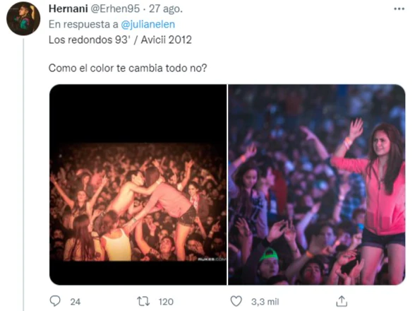 La foto era parte de otra publicación, realizada en Facebook por ‘Lore Avecilla’ y en el que esta mujer pedía ayuda para dar con ese joven: “Esto fue en Huracán, en el 93. En la entrada veo al chico este, ninguno de los dos nos conocíamos, fue un cruce de miradas nada más. Adentro, en pleno recital, suena ‘Un poco de amor francés’, me paro en los hombros de un loco y me encuentro cara a cara con este chico”, asegura.