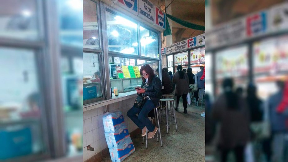 En la imagen se ve a una mujer muy parecida a la ex presidenta chequeando su teléfono celular, un una banqueta de un local en el que se vende pizzas y empanadas.