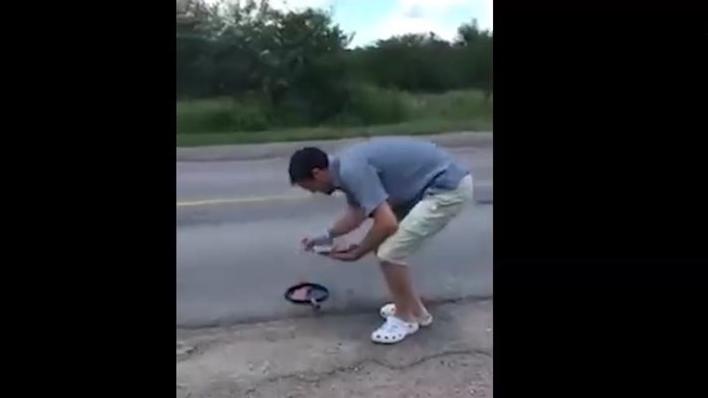 Marcos se grabó cocinando dos churrascos sobre el asfalto. Su termómetro marcaba 65°, así que la carne se cocinó bastante rápido.