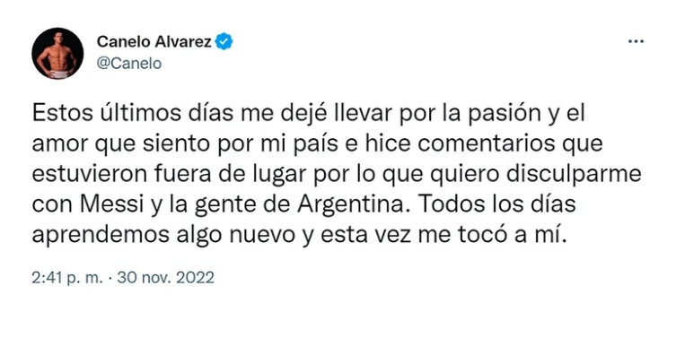 “Estos últimos días me dejé llevar por la pasión y el amor que siento por mi país e hice comentarios que estuvieron fuera de lugar por lo que quiero disculparme con Messi y la gente de Argentina. Todos los días aprendemos algo nuevo y esta vez me tocó a mí”, publicó Canelo en su cuenta de Twitter una hora antes de que su selección se enfrente a Arabia Saudita y la Albiceleste haga lo propio ante Polonia en la definición de la zona.