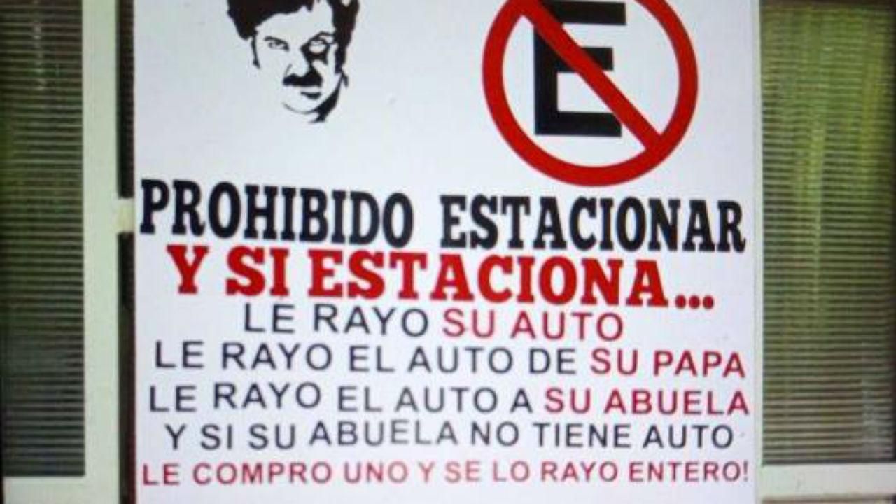 “Prohibido estacionar, y si estaciona… le rayo su auto, le rayo el auto de su papá, le rayo el auto a su abuela y si su abuela no tiene auto le compro uno y se lo rayo entero!”. Esa fue la advertencia que puso con la cara del personaje de Pablo Escobar en la serie Escobar, el patrón del mal.