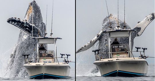 Un gran susto se llevaron pescadores y turistas de la zona de Monterrey Bay en California al presenciar el impactante salto de una ballena a sólo metros de una embarcación.