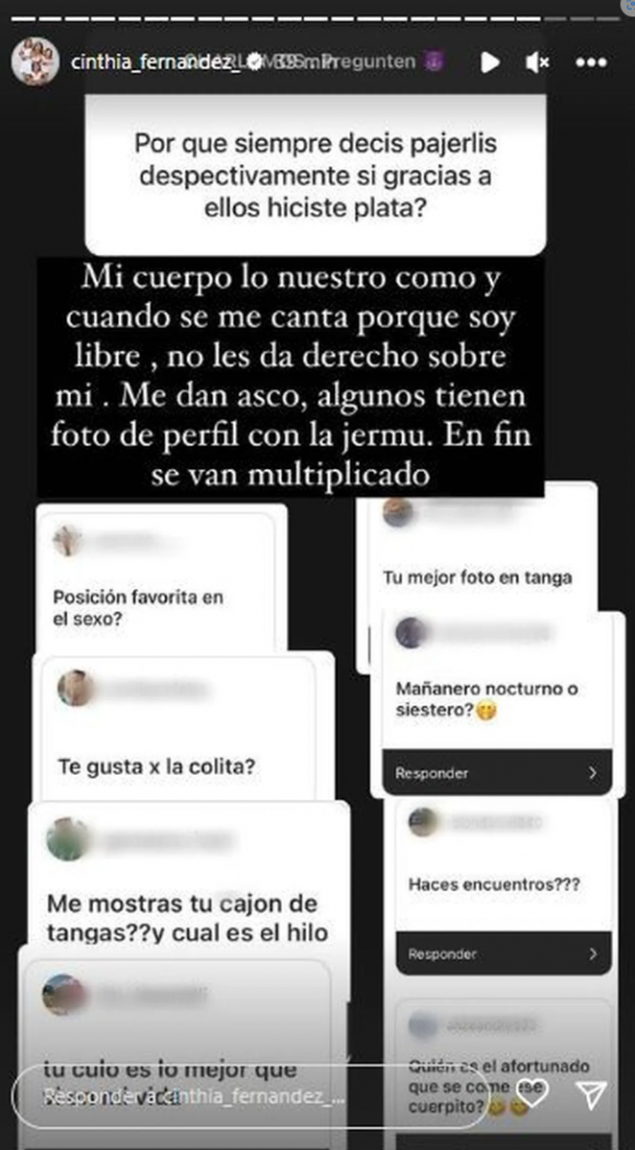 Cinthia Fernández respondió a todas las preguntas que le hicieron a través de sus stories de Instagram. Y le hizo frente a un usuario que la criticó por tratar de "pajerlis" a los varones que le envían mensajes obscenos.