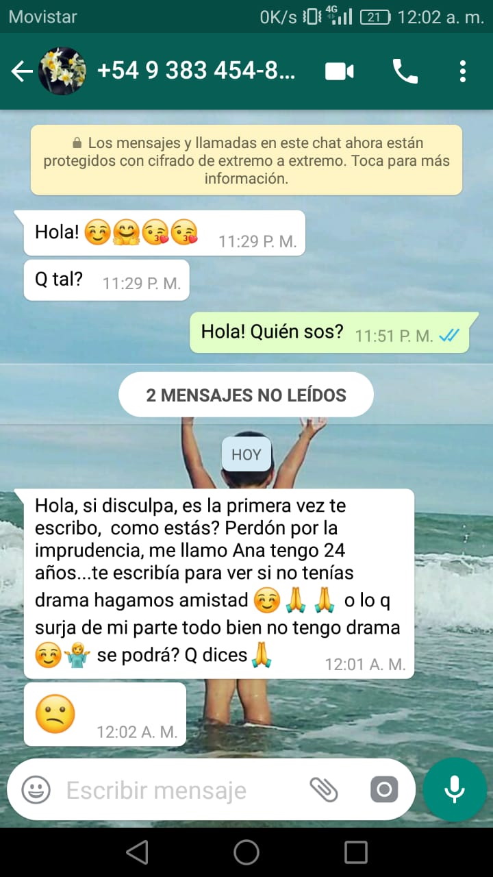 Es probable que la tal "Ana" ni siquiera sea de este país, ya que utiliza algunas palabras en un castellano neutro. Pero sigue: "Estoy en camita sola así te muestro algo hot de mi", afirma y pide realizar una videollamada. Si no hay respuesta por parte del destinatario, luego de unos momentos pide perdón.