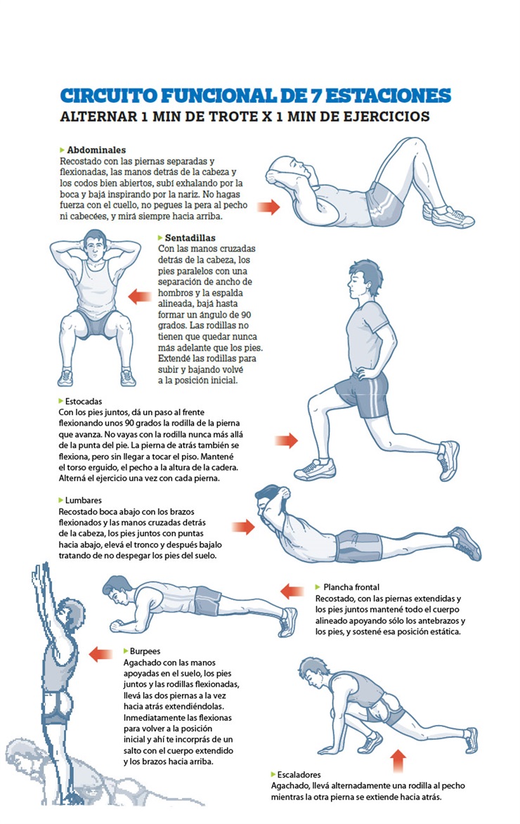 Acá te vamos a proponer un circuito de 7 estaciones para realizar sin ningún elemento más que tu cuerpo, fácil de realizar y apto para distintas condiciones físicas: tanto los principiantes como los avanzados podrán beneficiarse con su práctica adaptando los trabajos a su nivel jugando con la intensidad y el volumen según sus posibilidades.