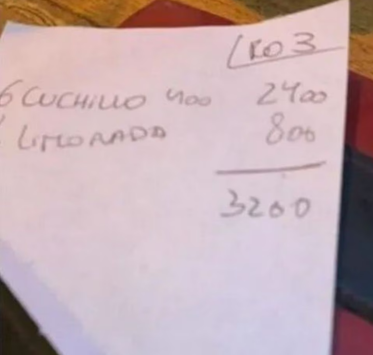 En la imagen compartida por el hombre, que se dedica a la supervisión de ventas de una empresa de bebidas, se puede apreciar el ticket escrito a mano con su pedido, que era muy simple: seis empanadas de carne cortada a cuchillo y una limonada.
