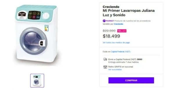 El valor del producto fue de $18.500, pero el error nace de que no era precisamente un electrodoméstico lo que estaba comprando. Lo que compró fue "Mi primer lavarropas Juliana luz y sonido". Sí: un juguete.